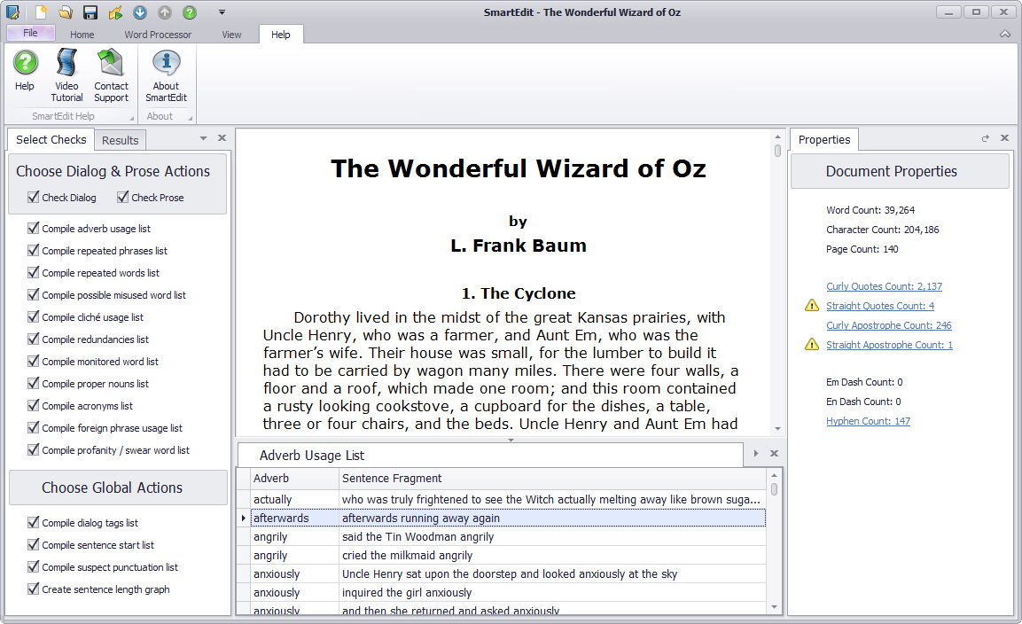 a list of every adverb used, flagging